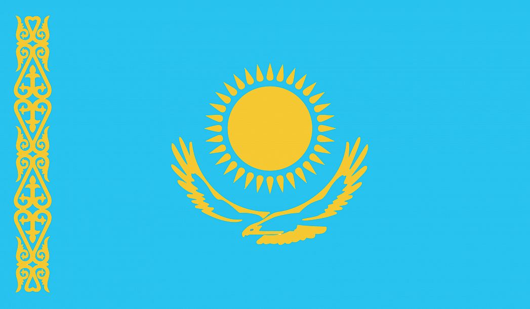 The national flag of the independent state of Kazakhstan contains a golden sun on it, with 32 rays emanating from the sun. The golden sun is positioned on top of a golden made steppe eagle. The two symbols are placed at the center of the sky-blue and a white background. On the top left corner of Kazakhstan's national flag is an ornamental pattern. The Kazakhstan flag is called the Kazakh flag. It was adopted in 1992 as a replacement for the Kazakh Soviet Socialist Republic flag.